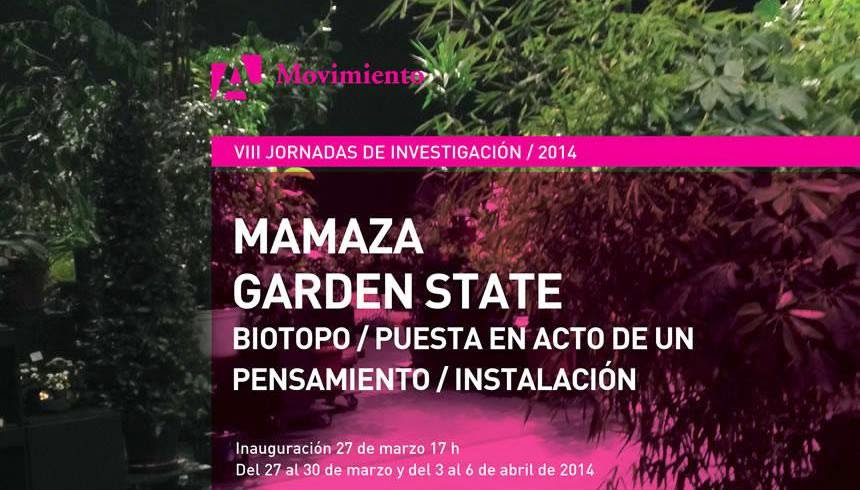 Una gran colección de plantas privadas de los habitantes de Buenos Aires recogidas por los artistas y re-compuestas como una isla móvil en un edificio del barrio de La Boca. Un ambiente de encuentro entre plantas y personas; un espacio maleable y libre para ser habitado; donde las personas pueden tener todo tipo de interacciones o actividades: conciertos, siestas, conferencias, saludos al sol, performances o recibir la noche con el canto de grillos. Para esta asamblea botánica general, MAMAZA crea junto a un grupo de arquitectos un biotopo coreográfico único. Las protagonistas de esta coreografía son las innumerables plantas en macetas de todo tipo de especies, tamaños y formas. Están invitados a traer su propia planta en una maceta con calidad de préstamo permitiéndoles ser parte de Garden State.
